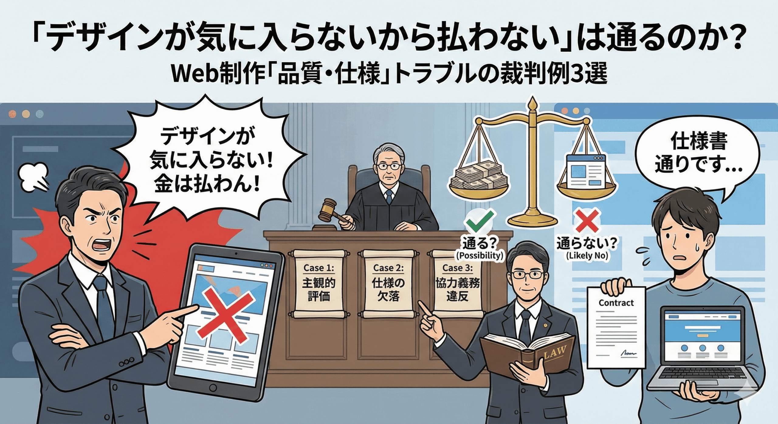 「イメージと違うから払わない」は通用する?Web制作で頻発する「品質・仕様」のトラブル。実は、単なる「気に入らない」では支払いを拒めないケースが大半です。本記事では、実際の裁判例を3つ挙げ、法的な「品質」の基準を解説。発注者の「協力義務」とは?仕様書の落とし穴とは?泥沼の紛争を避けるための必須知識を、現役IT弁護士が伝授します。【詳細は下の記事をご覧ください】